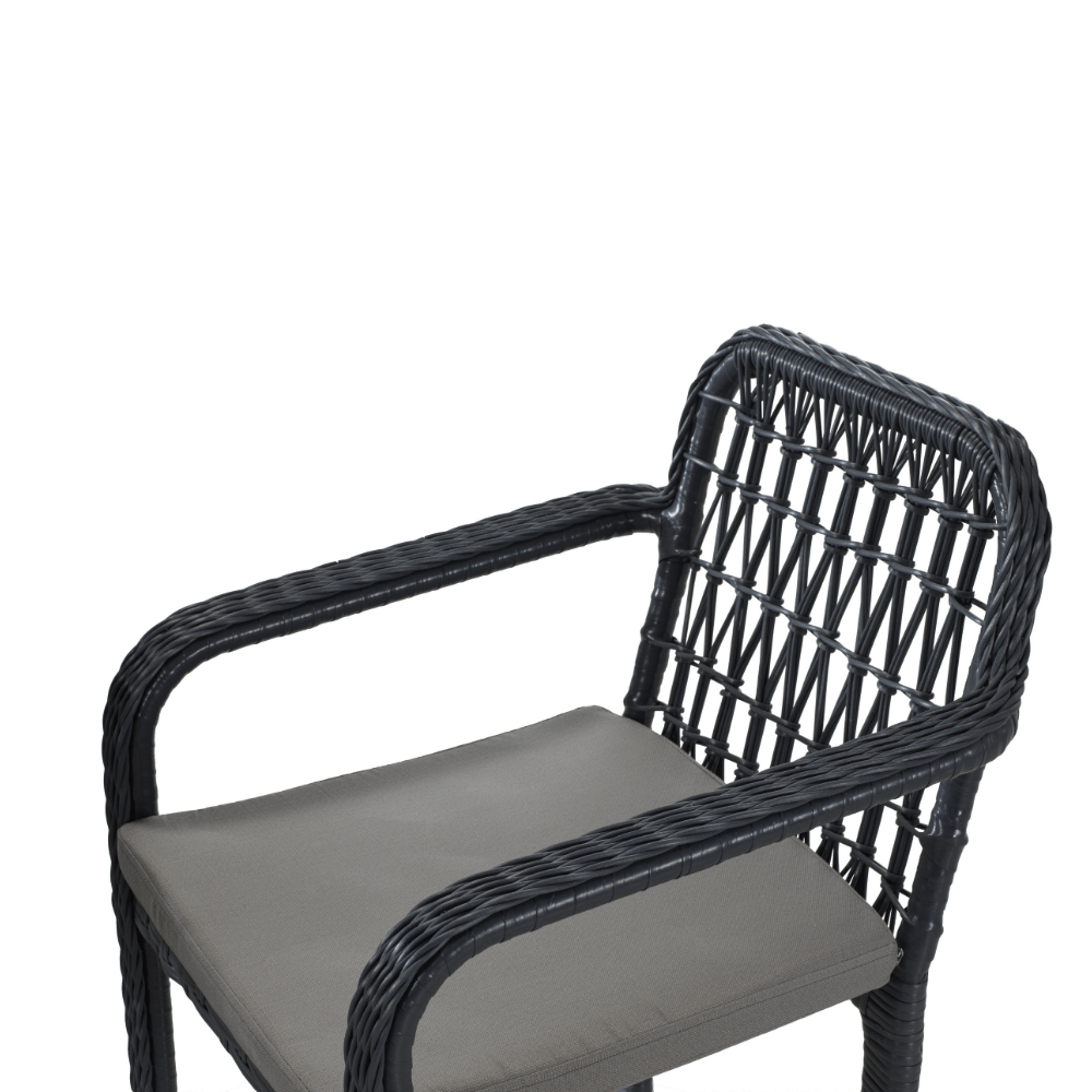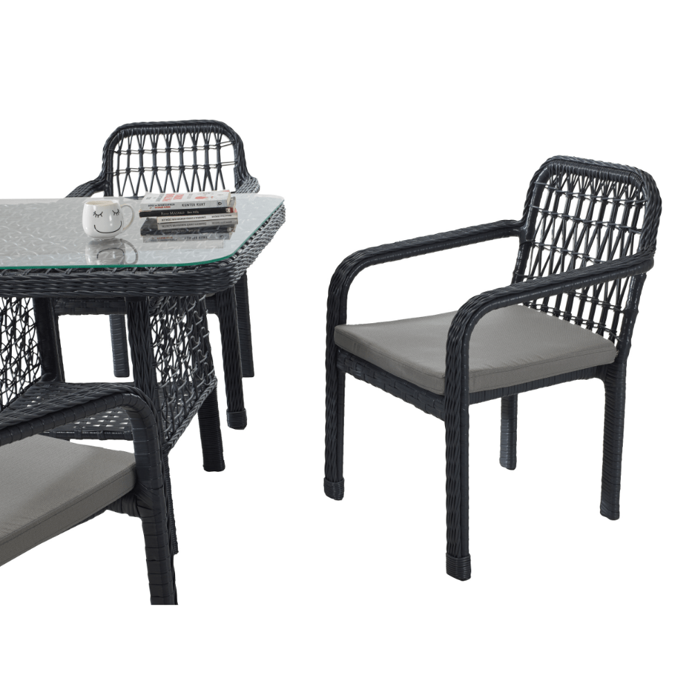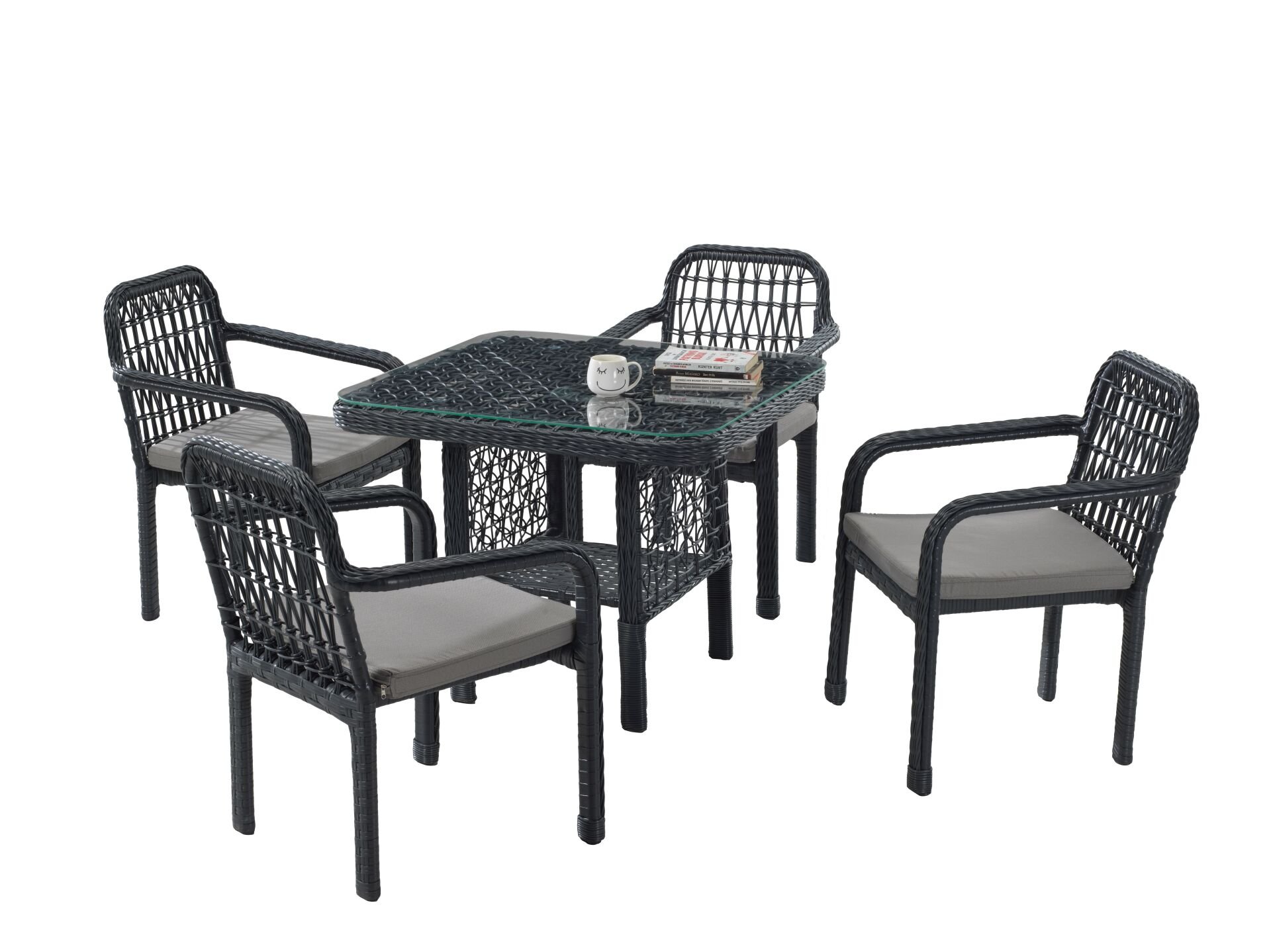 UV ışınlarına dayanıklı, renk solmasına karşı dirençli kaliteli sentetik rattan örgü ile üretilmiştir. Dört mevsim kullanıma uygundur.