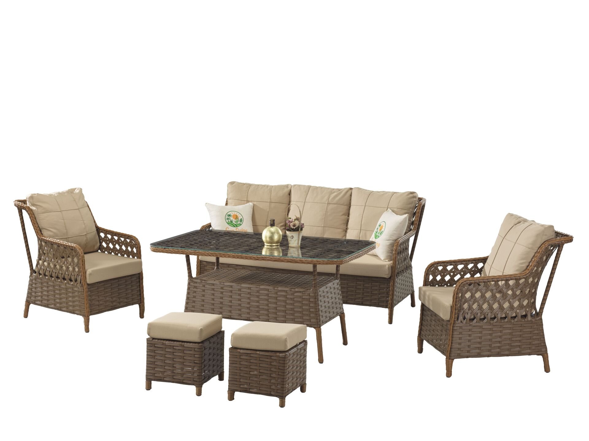 UV ışınlarına dayanıklı, renk solmasına karşı dirençli kaliteli sentetik rattan örgü ile üretilmiştir. Dört mevsim kullanıma uygundur.
