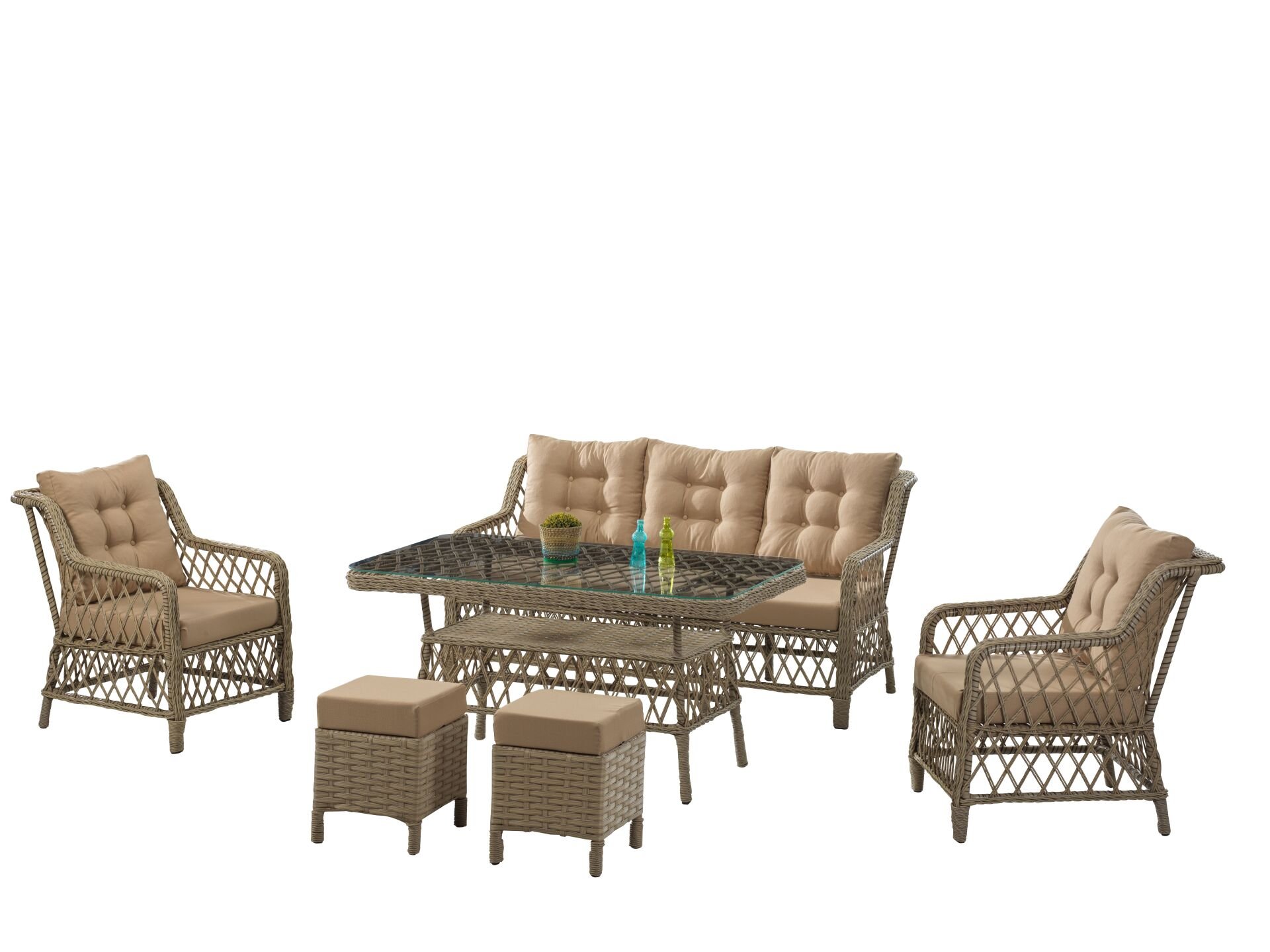 UV ışınlarına dayanıklı, renk solmasına karşı dirençli kaliteli sentetik rattan örgü ile üretilmiştir. Dört mevsim kullanıma uygundur.