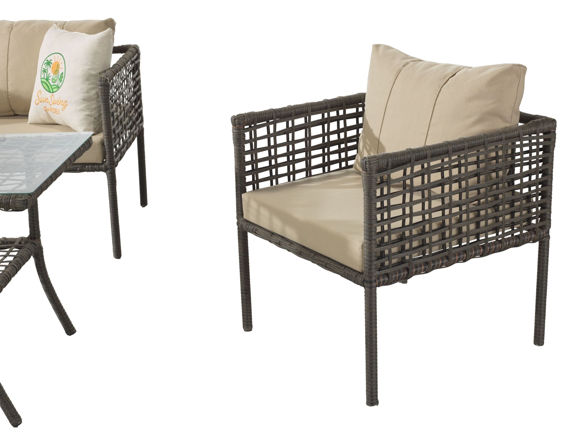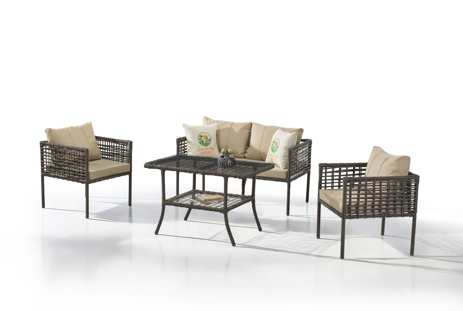 UV ışınlarına dayanıklı, renk solmasına karşı dirençli kaliteli sentetik rattan örgü ile üretilmiştir. Dört mevsim kullanıma uygundur.